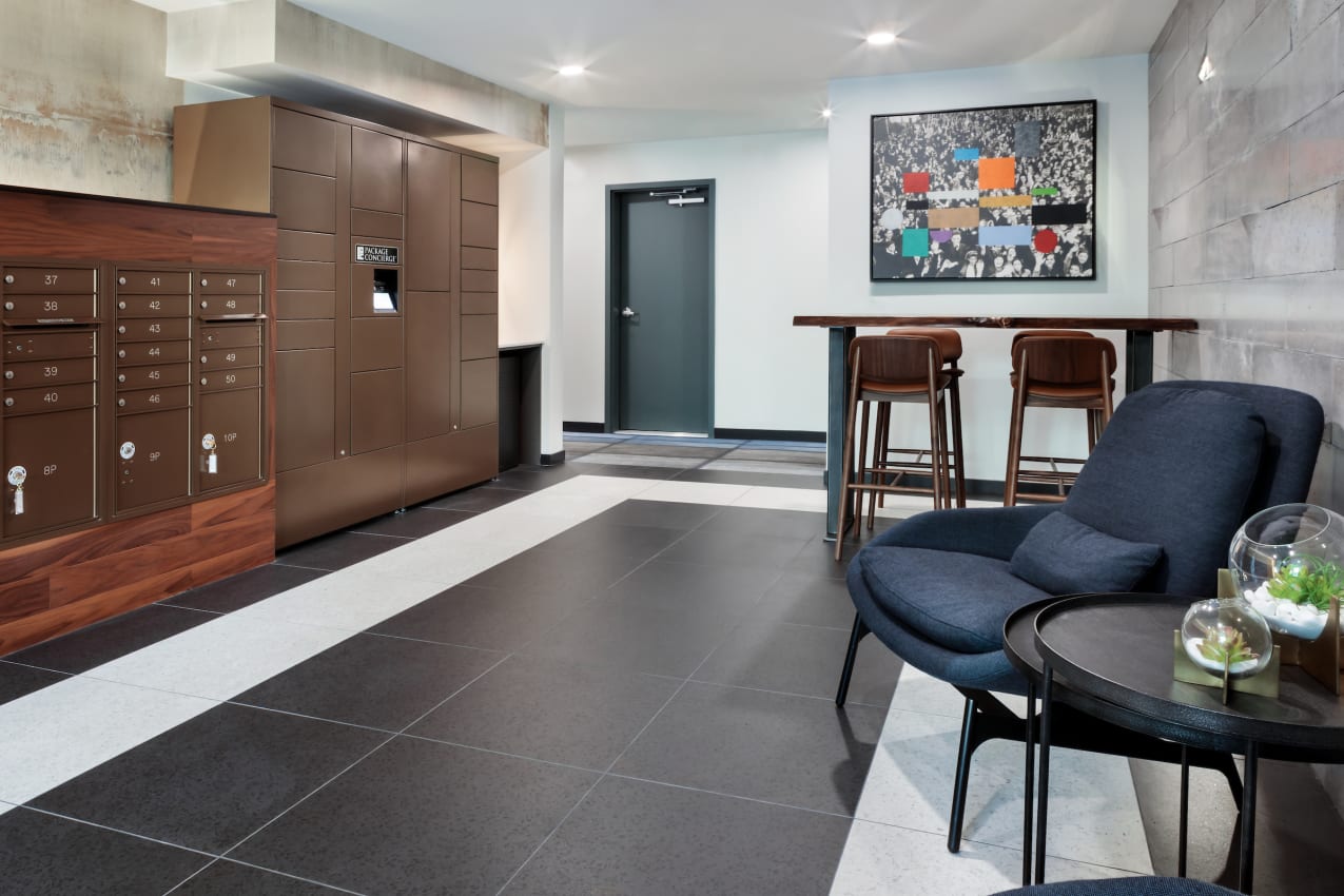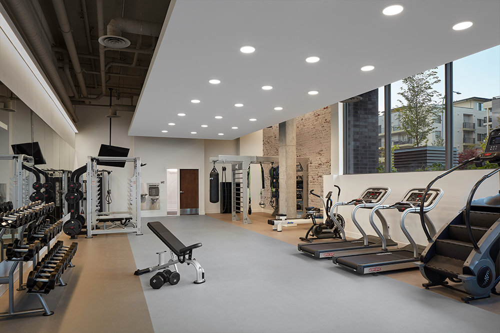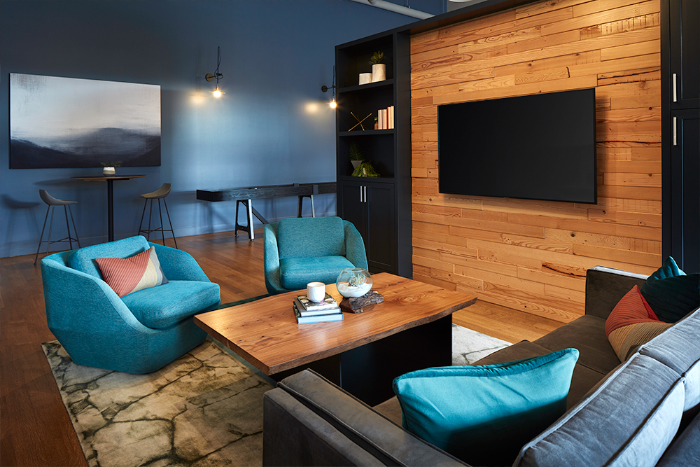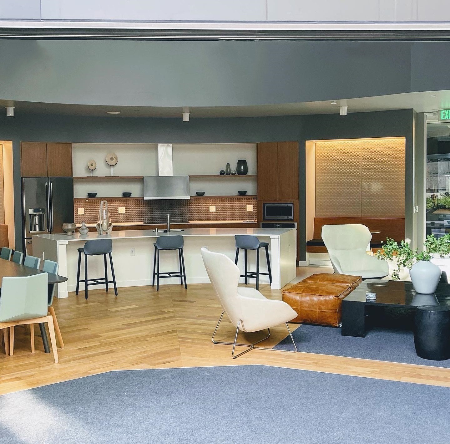 Amidst the CHOP chaos on Seattle’s Capitol Hill we proudly worked with Mill Creek Residential on designing a peacefully serene environment for residents at Emerson Seattle. It took a fair amount of perseverance but the results speak for themselves. The finishes are truly remarkable, with the resident lounge featuring hardwood floors and a felted wool broadloom insert area rug, while the kitchen boasts a porcelain floor and mosaic sheet tile on the rounded wall. The theater has #hardwood and carpet tiles, and the fitness room showcases a glass tile wall and rubber floor tiles. The living units are decked out in luxury vinyl plank with beautiful ceramic tile backsplashes in the kitchens.
