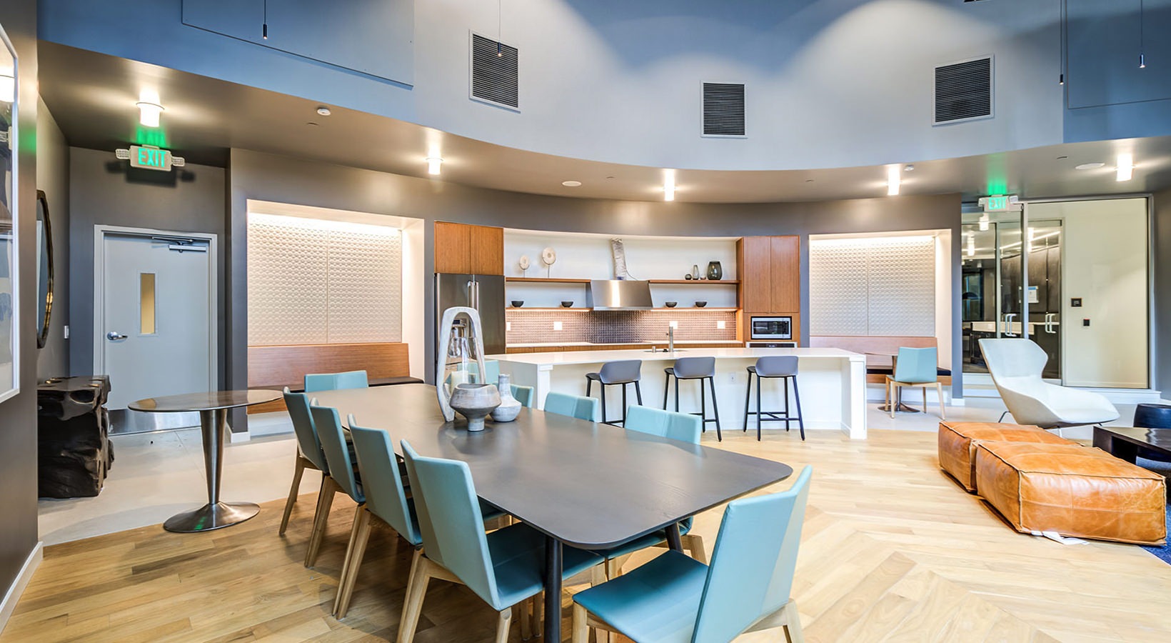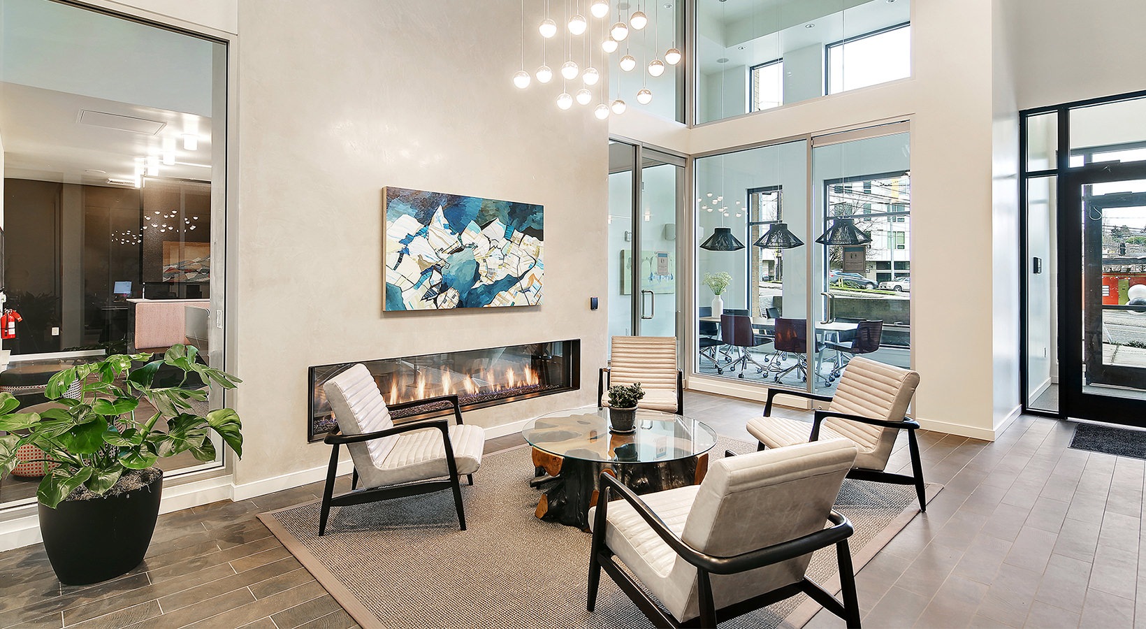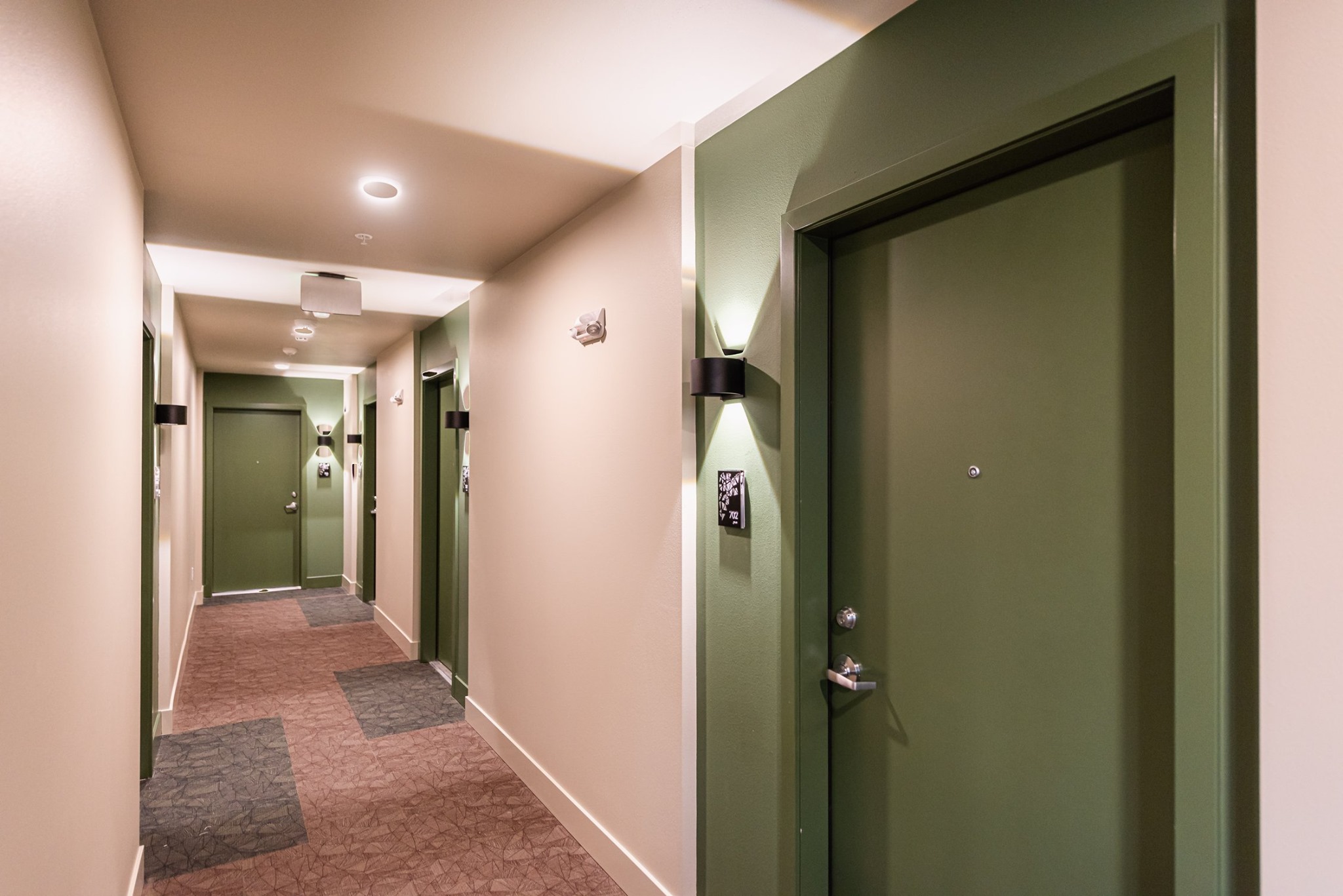 Amidst the CHOP chaos on Seattle’s Capitol Hill we proudly worked with Mill Creek Residential on designing a peacefully serene environment for residents at Emerson Seattle. It took a fair amount of perseverance but the results speak for themselves. The finishes are truly remarkable, with the resident lounge featuring hardwood floors and a felted wool broadloom insert area rug, while the kitchen boasts a porcelain floor and mosaic sheet tile on the rounded wall. The theater has #hardwood and carpet tiles, and the fitness room showcases a glass tile wall and rubber floor tiles. The living units are decked out in luxury vinyl plank with beautiful ceramic tile backsplashes in the kitchens.