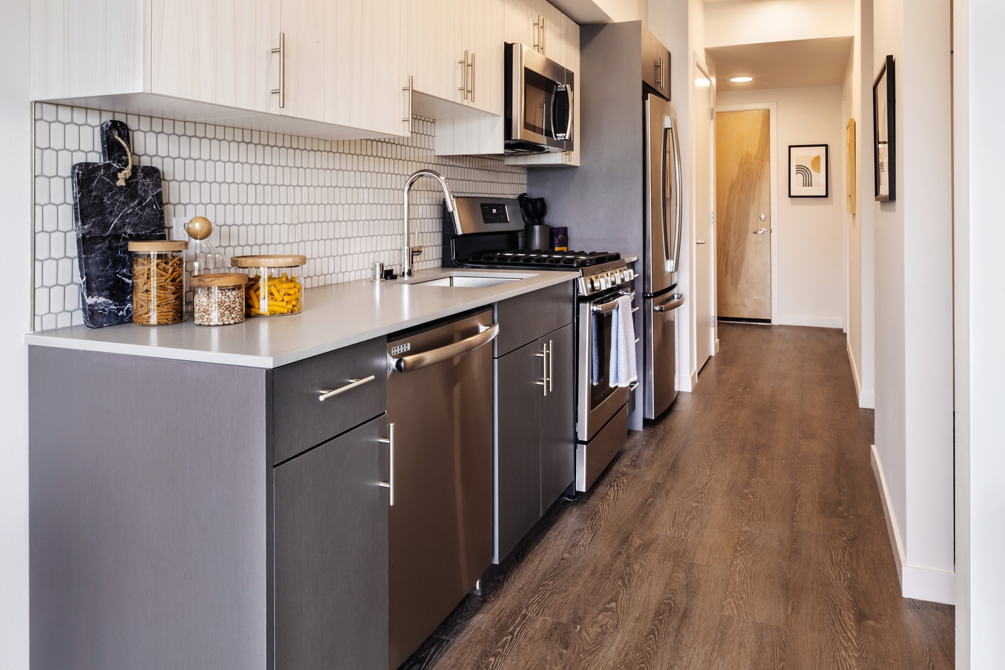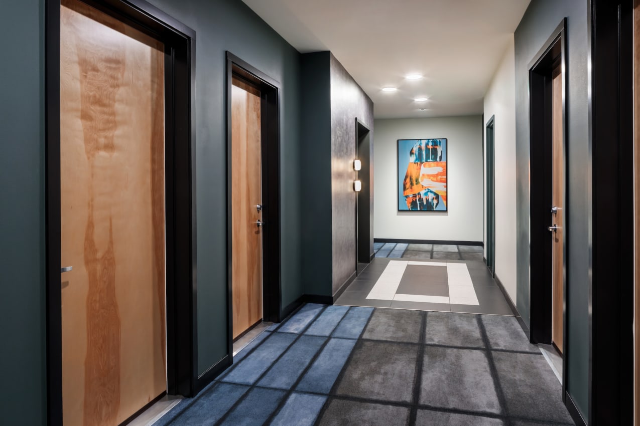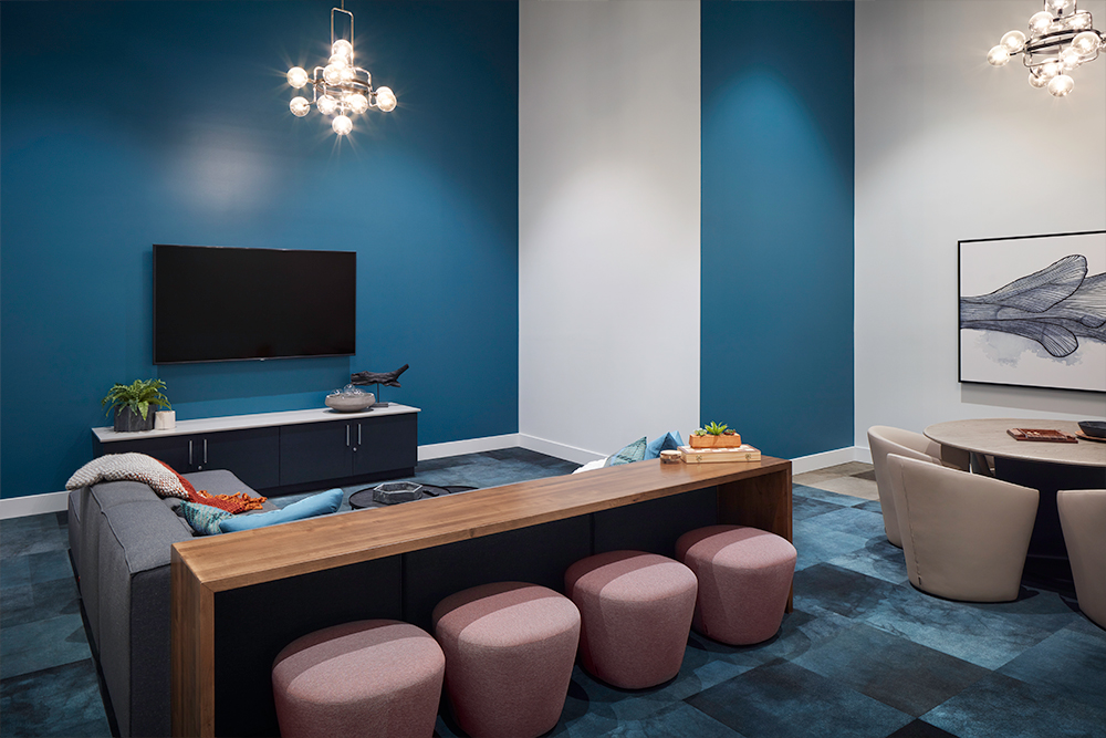 At Clark SLU Apartments we incorporated thoughtful details such as Luxury Vinyl Plank and subway tile in all living spaces. Common areas include carpet tile in the corridors, octagon ceramic tile in common restrooms, and colorful cement tile on the lobby walls.