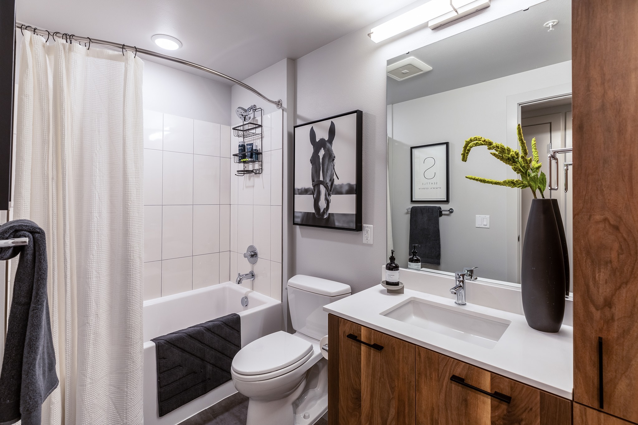 AFB brought together an eclectic mix of luxury finishes at Alexan 100 Apartments on lower Queen Anne. The pictures speak for themselves, but we can’t help but boast of the beautiful common areas featuring tile walls, floors, and backsplashes, as well as broadloom carpet, LVT, and carpet tile. The living units feature LVP, broadloom carpet, and ceramic tile on the backsplashes, butler pantries, and shower surrounds.