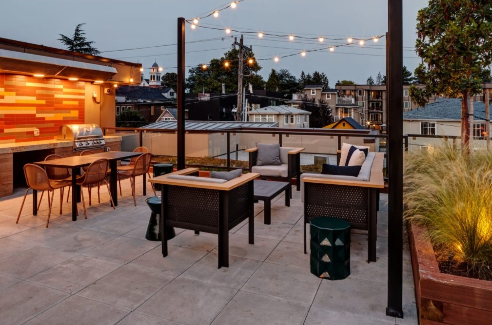 Aside from some challenges finding parking in Seattle’s busy Cherry Hill neighborhood, The CC Apartments project was a breeze! The apartments and townhomes feature luxury vinyl plank, with mosaic tile kitchen backsplashes. The lobby features a cool torn-look, backlit tile accent wall, and natural terrazzo black and white tile on the floor. The common area showcase a variety of carpet tile, with LVP laid in a herringbone pattern in the elevators. The ceramic tile backsplash on the rooftop BBQ amenity is the cherry on top of a very fun project.